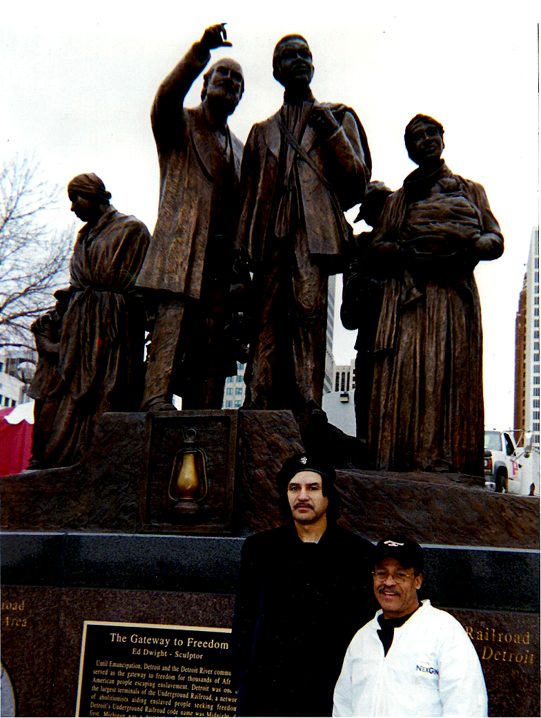 Astronaut Ed Dwight: Flight Surgeon Dr. Lewis Milburn was deputy director of Aerospace Medicine (Astronaut Dr. Mae C. Jemison NASA Medical Science tradition) when Dwight became the first Black astronaut trainee at N.A.S.A. during the John F. Kennedy Presidency. A generation later, Dr. David Milburn and Sculptor Ed Dwight standing in front of Dwight's "magnum opus" Underground Railroad Memorial Monument on Detroit's riverfront Hart Plaza. Before a capacity crowd of Underground Railroad descendants participating in the Underground Railroad Families Historical Society's "Memorial Ceremony", dignitaries (Mayor Dennis Archer, Aretha Franklin) and descendants placed memorial wreaths of remembrance (Anniversary Celebration) at the riverfront Detroit- Windsor Underground Railroad Memorial Monuments.After the 1993 completion of Dwight's Underground Railroad Battle Creek Memorial,Dr.David Milburn was instrumental in facilitating the concept of Detroit Windsor riverfront Memorial Monuments.